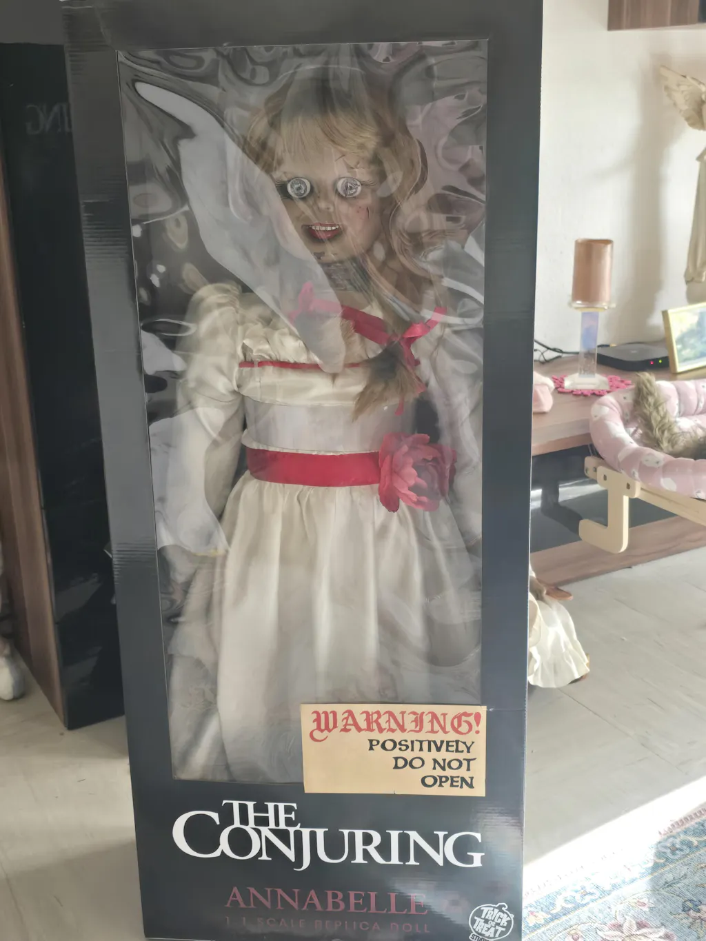 The Conjuring Annabelle Puppe Replica weiß/rot, Originalkarton-Design. Hersteller: Trick or Treat.